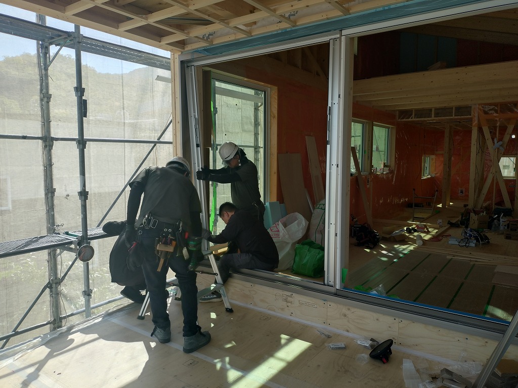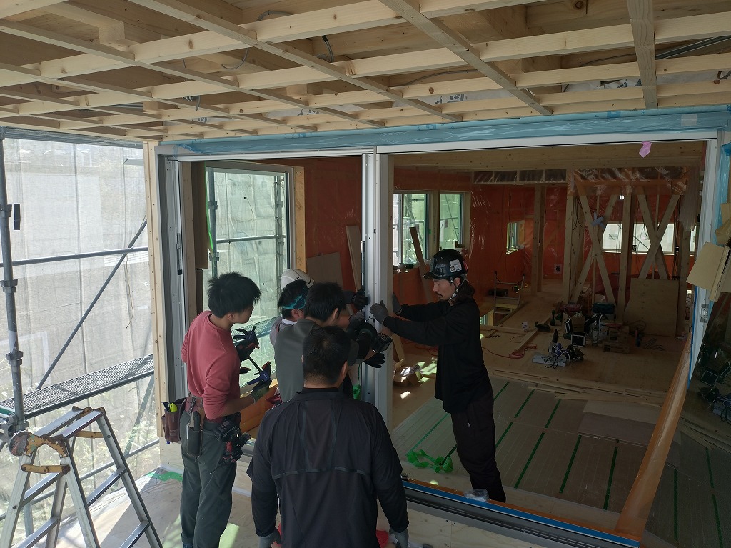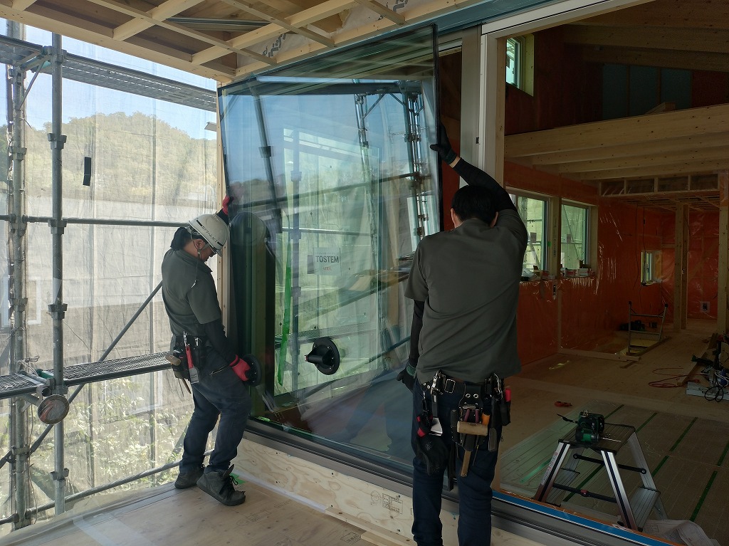 このサッシの一番の難関ヶ所は、ガラスが大きいという点です。 大きければ当然重量も多く、上下に分かれて4人で荷上げしました。