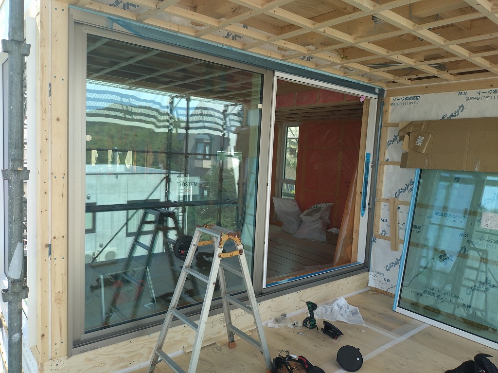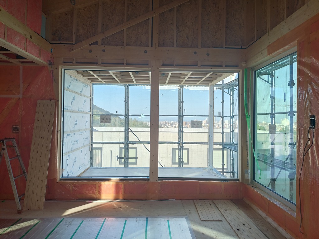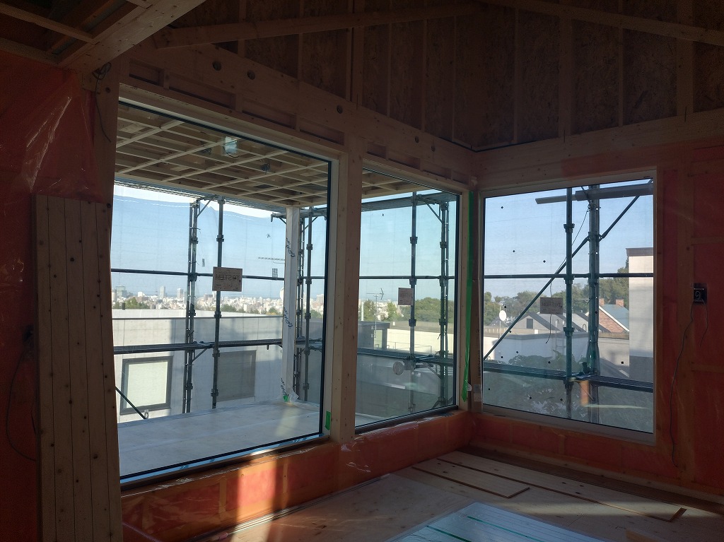 コーナーの窓は札幌中心部の街並みを見渡せる眺望となっています。 右側のサッシは、これから大工さんが四方フカシ材を取り付けて、どんどんサッシ枠の存在を魔法の様に消していきます!