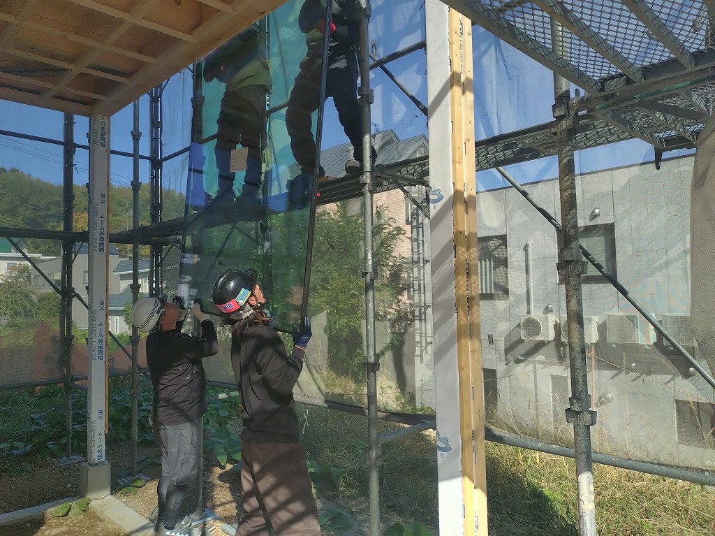 きっちり、ガラスはめ込みの為のアルミ枠を納めたら、あとは、いよいよガラス入れです。 この工程は、事前の段取りがしっかりしていたため、スムーズに進みました。