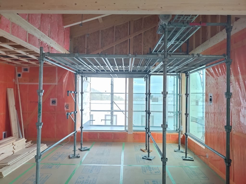 二階のさらに上にはロフトがあり、この部分を工事するために内部足場を組みました。 階段と干渉するため、階段部分を後ほど解体できるように工夫した足場です。