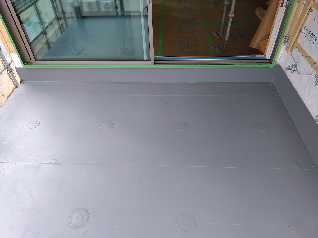 バルコニーの床はシート防水です。 塩ビシートによる防水で、屋根勾配がゼロでも防水できる商品です。