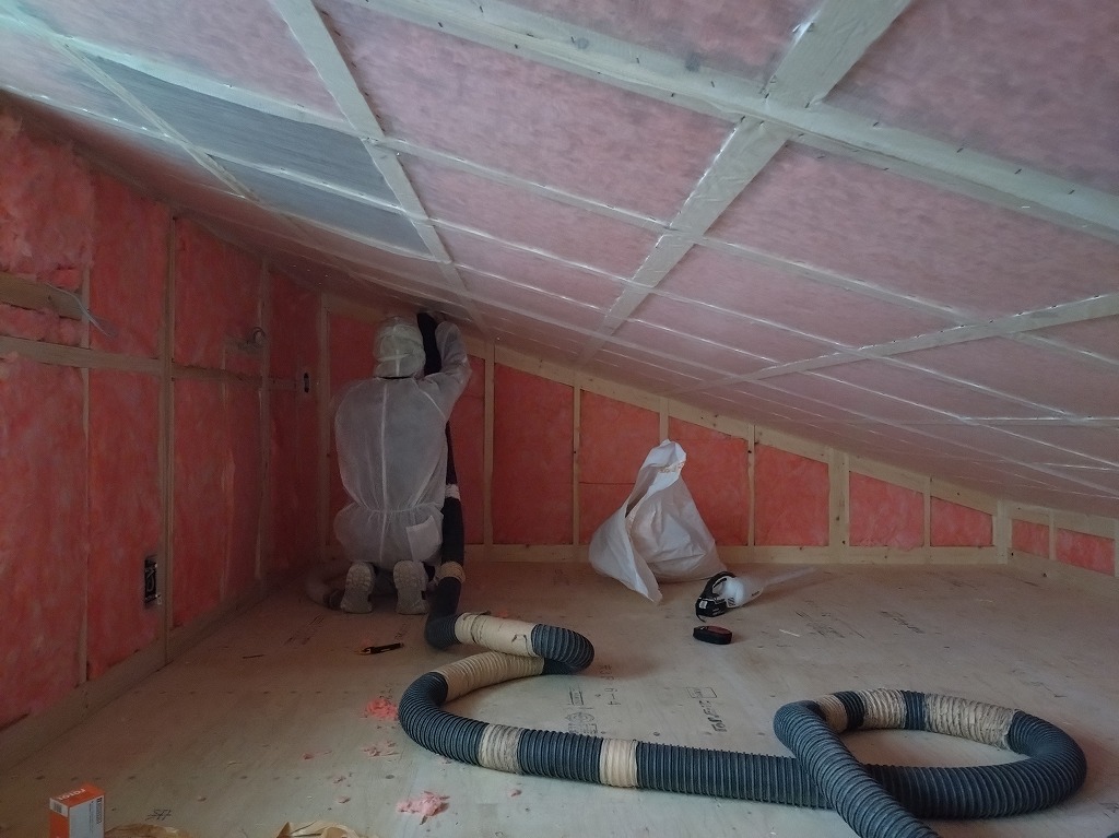 二階の天井では、ブローイング(断熱材を吹きこむこと)を行いました。 斜め天井部分は、ネットを張り断熱材が落ちないように受けながら施工しています。