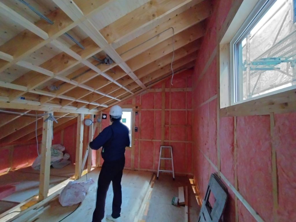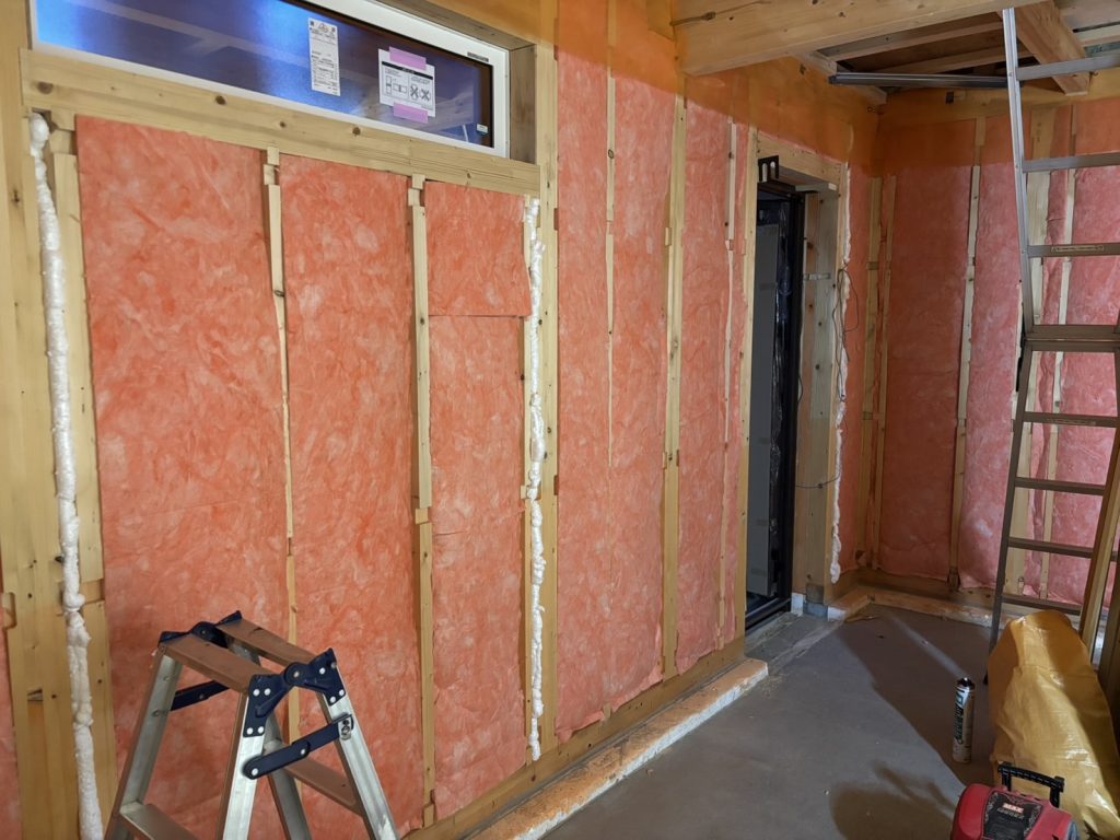 躯体の内側(柱と柱、柱と間柱などの間)にグラスウールを入れていきます。