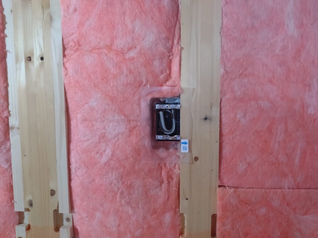 コンセントやスイッチが付く個所には、気密ボックスを取り付けます。写真の中央にある透明なカバーが気密ボックスです。