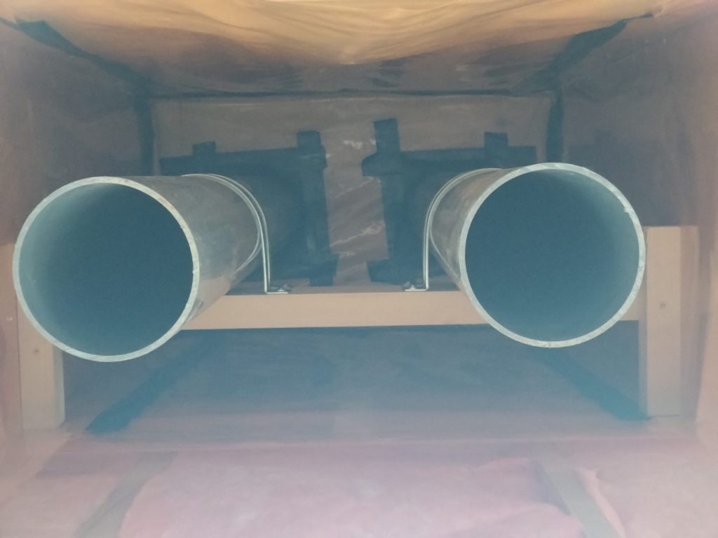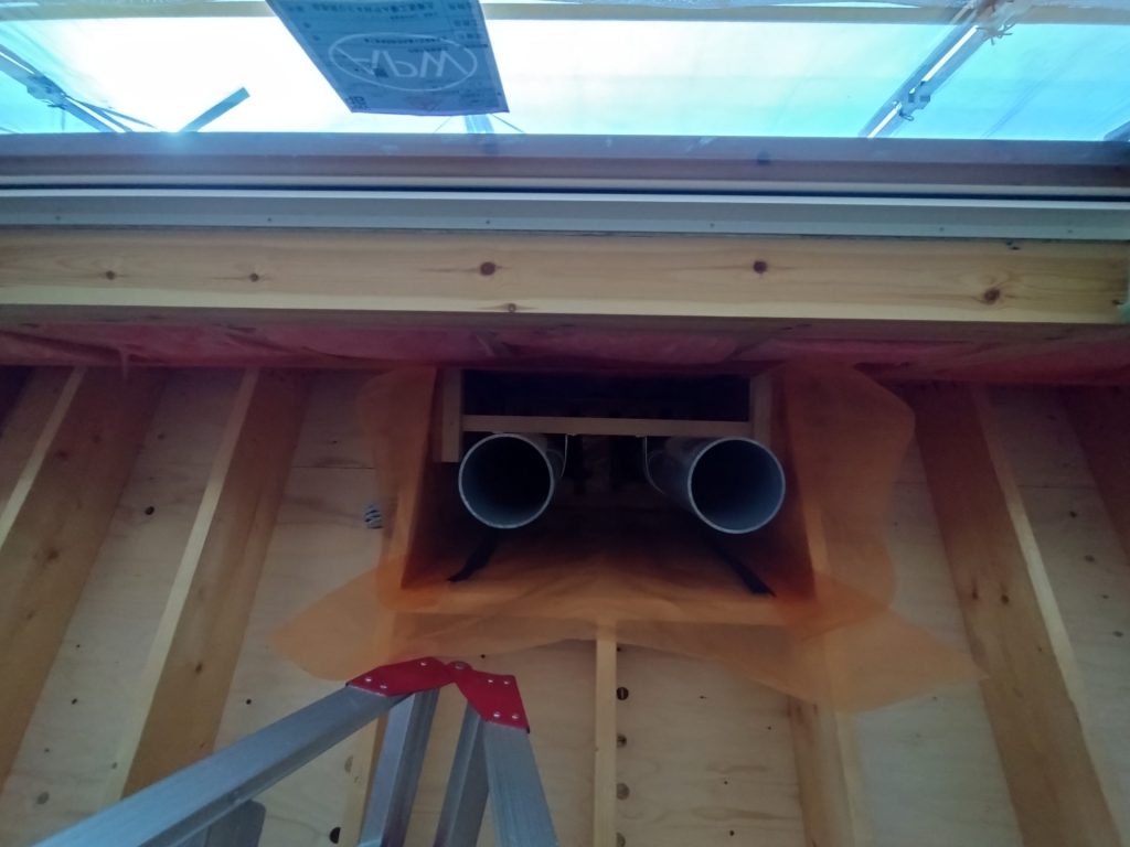 下地を組んで、配管を通しています。パッシブ換気の効果を最大限にするために、排気の位置を可能な限り高い位置に設計しています。