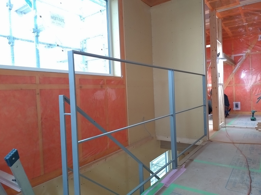 階段をのぼり、二階部分には吹き抜けの手摺があり、これも鉄骨です。 デザインと取付固定が、ちょうどよいバランスになるように、設計者と施工者の両方の立場から考え、計画しました。(手間をかければ施工が難しくなり、仕上がりも悪くなります。 簡単に施工できるようにすれば、デザイン性が悪くなる場合も多く、両方からの目線で、事前協議を行い、決定しました)