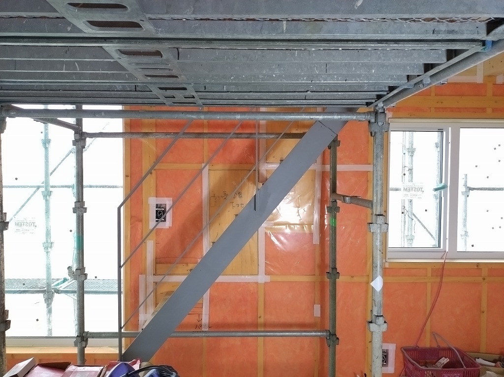 2階への鉄骨が組み終わりました。 階段を上るときにかかる力を階段下収納のカウンターで受けずに、剛床まで力をかけるような計画にしました。