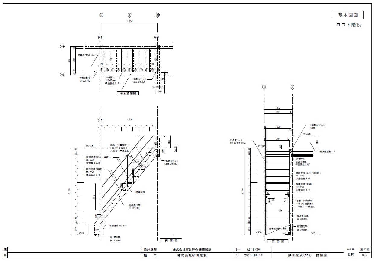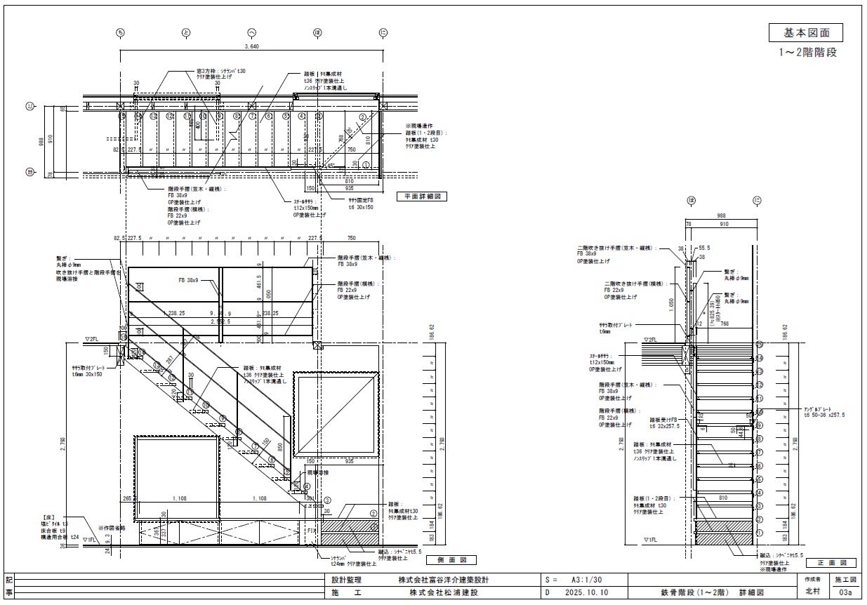 S様邸の階段は2か所あって、1~2階への階段と、2階~ロフトへの階段です。 鉄骨階段を施工管理するために、私の場合は、まず施工図を作成します。 その後、設計監理者の承認を取り、ファブリケーター(通称:ファブ。実際に鉄骨工事の施工をする業者)へ渡します。