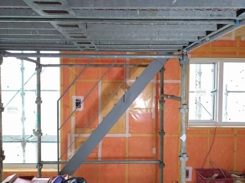 札幌市中央区 S様邸【設計監理:富谷洋介建築設計様】内部造作工事と天井ブローイング工事 現場レポート 2025年10月17日 「富谷洋介建築設計」様の設計・監理の札幌市中央区S様邸では、大工さんによる内部造作工事が進んでいます。 壁と天井に木下地を組み、その上から石膏ボードを張っています。 構造体である梁と床合板が現しとなるか所もあり、木質感の…