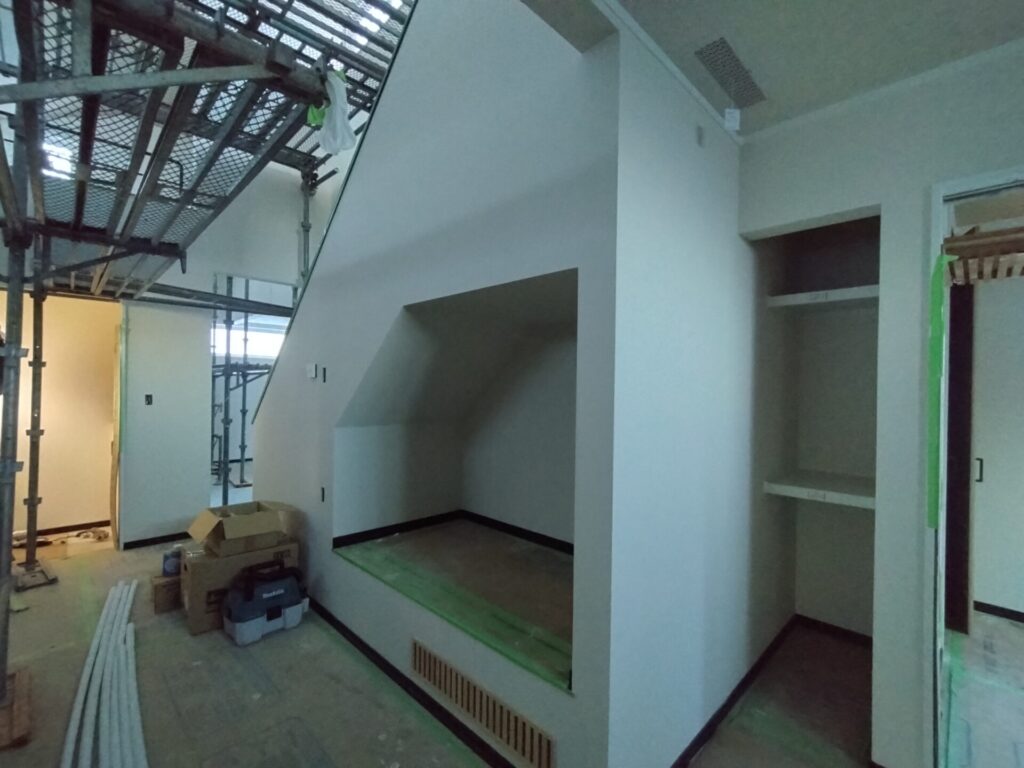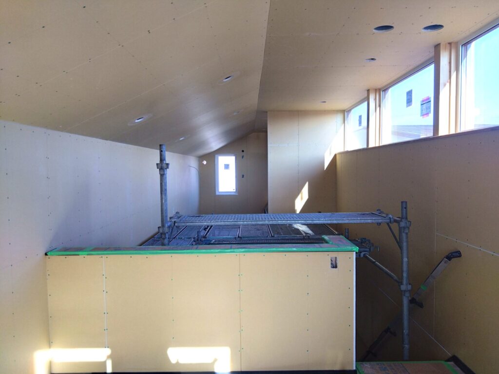 木工事が終わり、内部足場を立て、クロス工事が入ります。