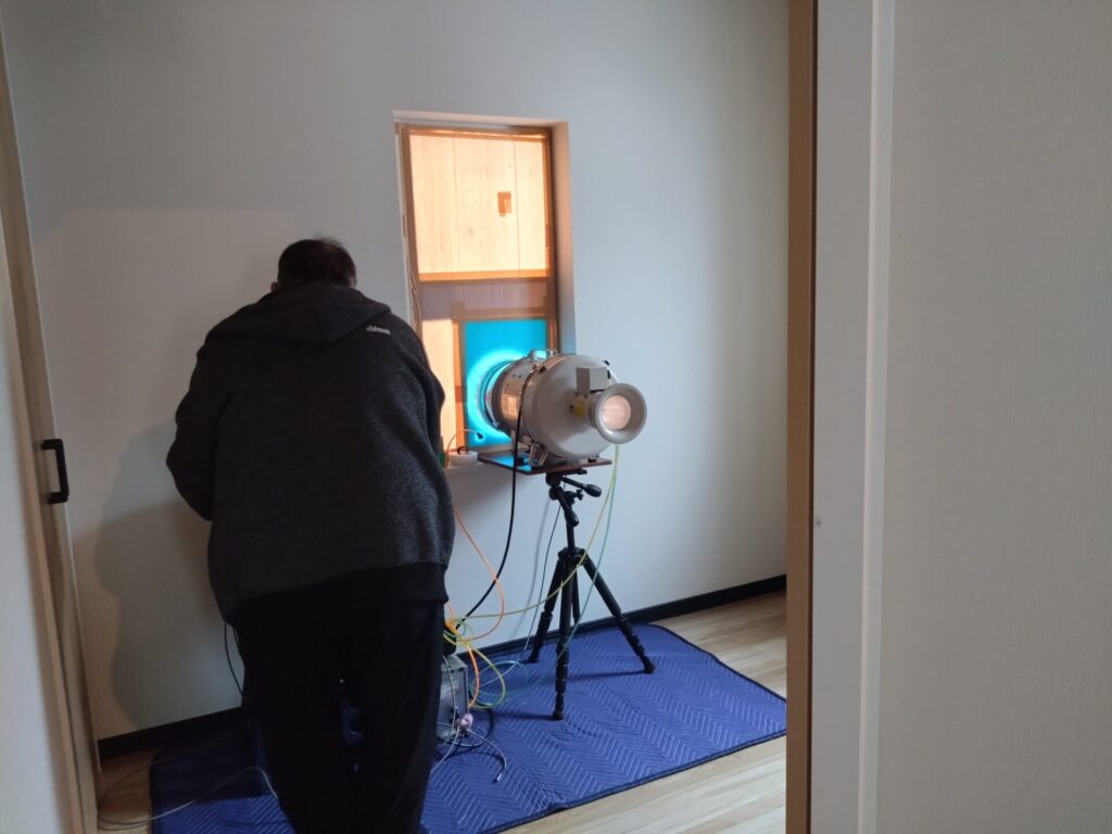お引渡し前の気密測定をしています。風も弱く、測定には良い日和でした。