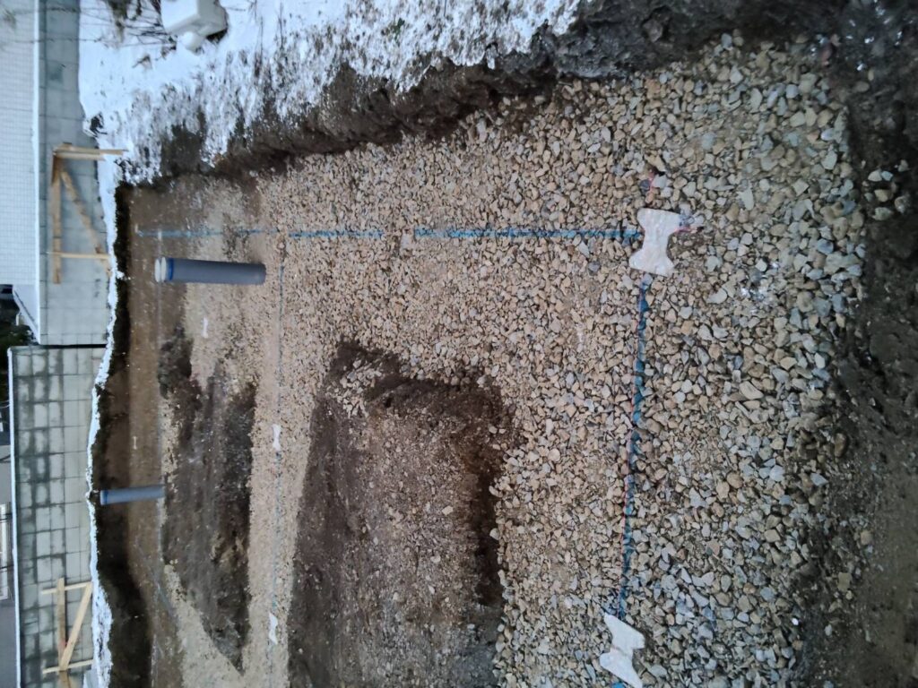 上の写真の左上に見えているパイプはパッシブ換気の給気口につながる管です。青いマーカーの所々に地盤補強のコンクリートパイルが見えます。
