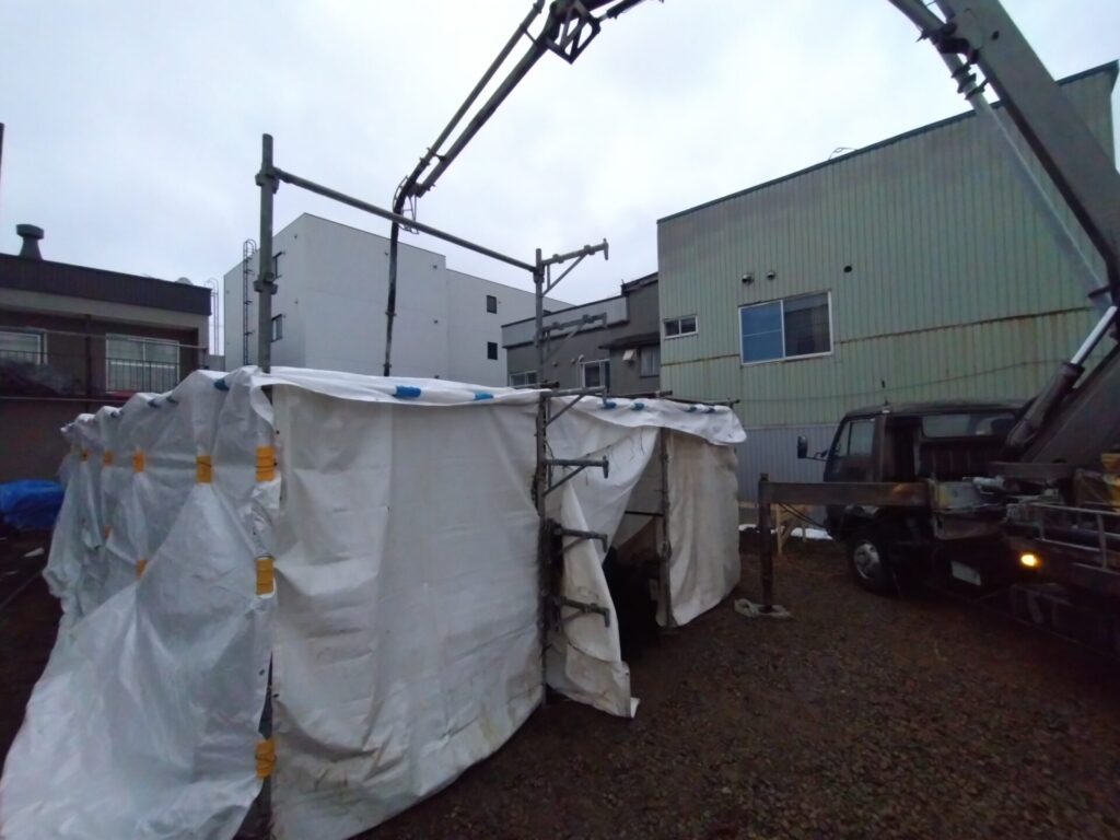 配筋検査を受けた後、土間コンクリートを打設します。冬場なので仮設で覆われています。