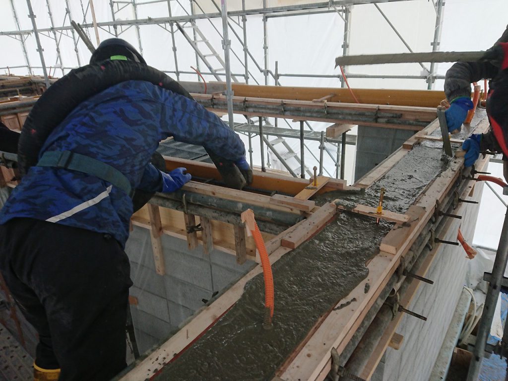 江別市 S様邸【設計監理:山之内建築研究所様】 臥梁鉄筋検査とコンクリートの打設