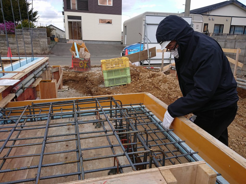 江別市 Y様邸【設計監理:山之内建築研究所様】 基礎の鉄筋組と配筋検査(現場では新型コロナ対策のため、3密排除を徹底しています)