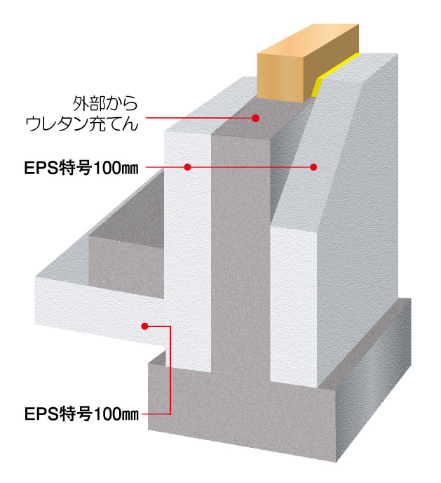 基礎の断熱材には、水に強く、過酷な環境下でも断熱性能が長期にわたりほとんど変化しないEPS断熱材100ミリで基礎コンクリートをサンドイッチ。
