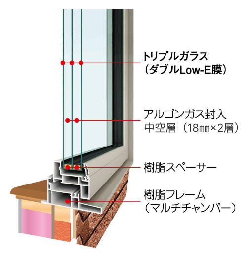 断熱性能の高い窓は外気の影響を受けにくいので、表面の温度が下がらず結露が抑えられ、窓際でのヒンヤリ感もなくなります。エコットハウスは高性能トリプルガラスを採用しています。