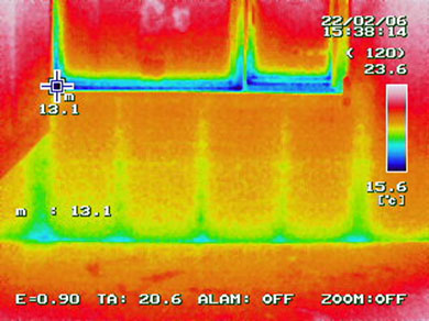 サーモ画像を見ると、窓下に暖房器(放熱器)がないにもかかわらず、窓枠下部など温度が下がりやすい部位(青色・水色部分)でも13℃以上あり、ガラス面は壁と変わらない温度を維持しています。