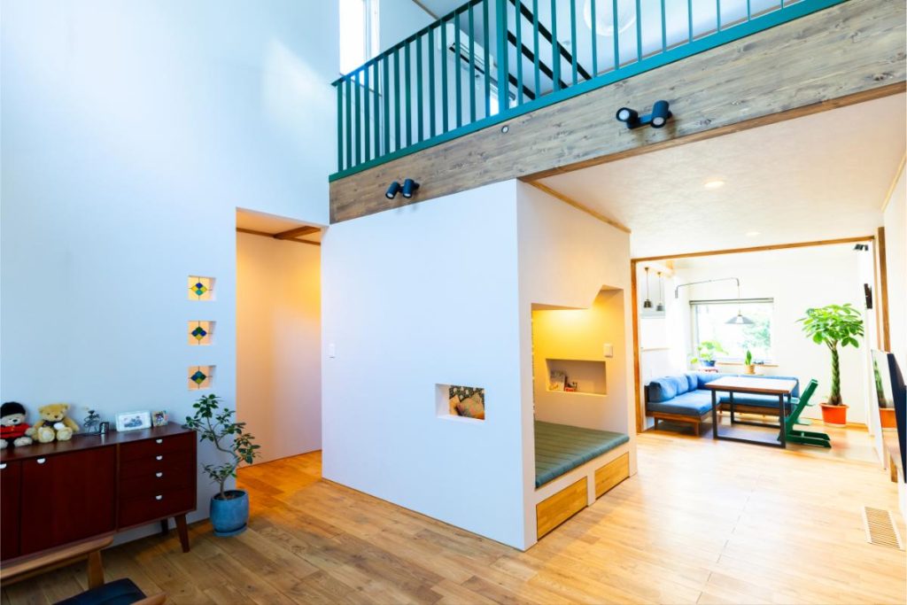 階段下のヌックを挟んで広がる吹き抜けのリビング