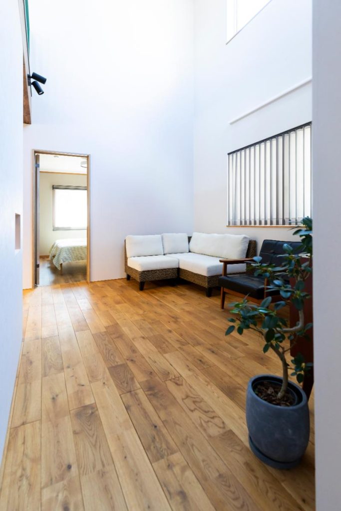 ヌックの奥に、吹き抜けのリビングが続いています。