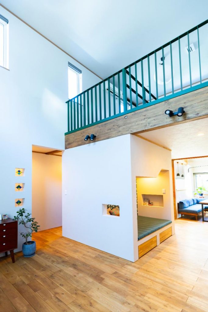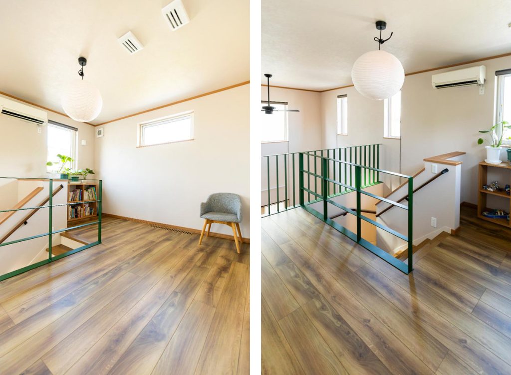 リビングは2階フリースペースと空間でつながっています。グリーンに塗った手すりも良いアクセントに。