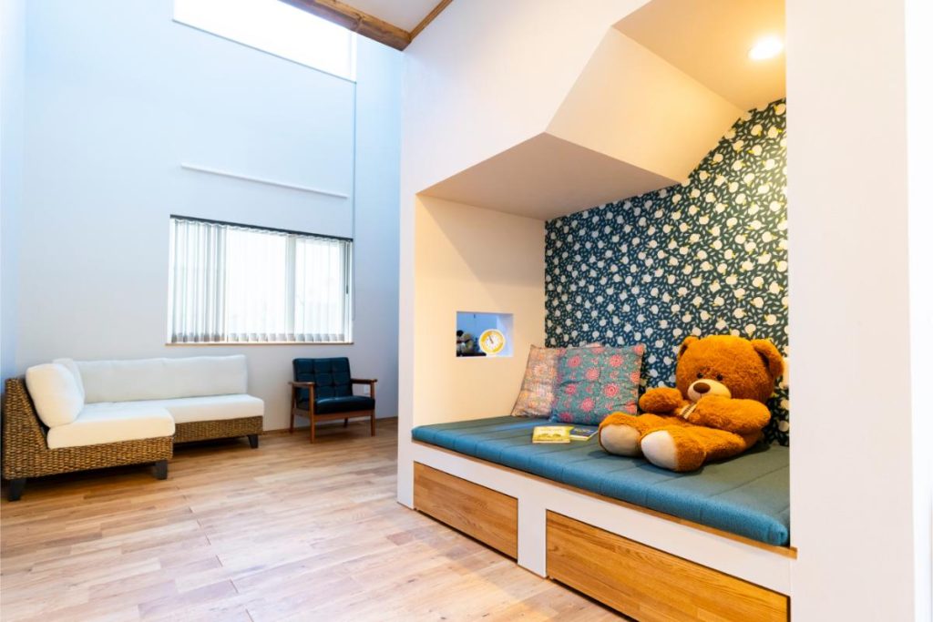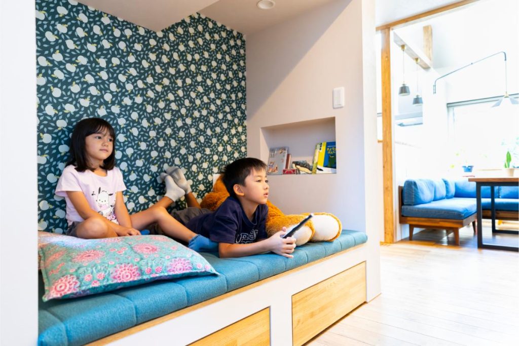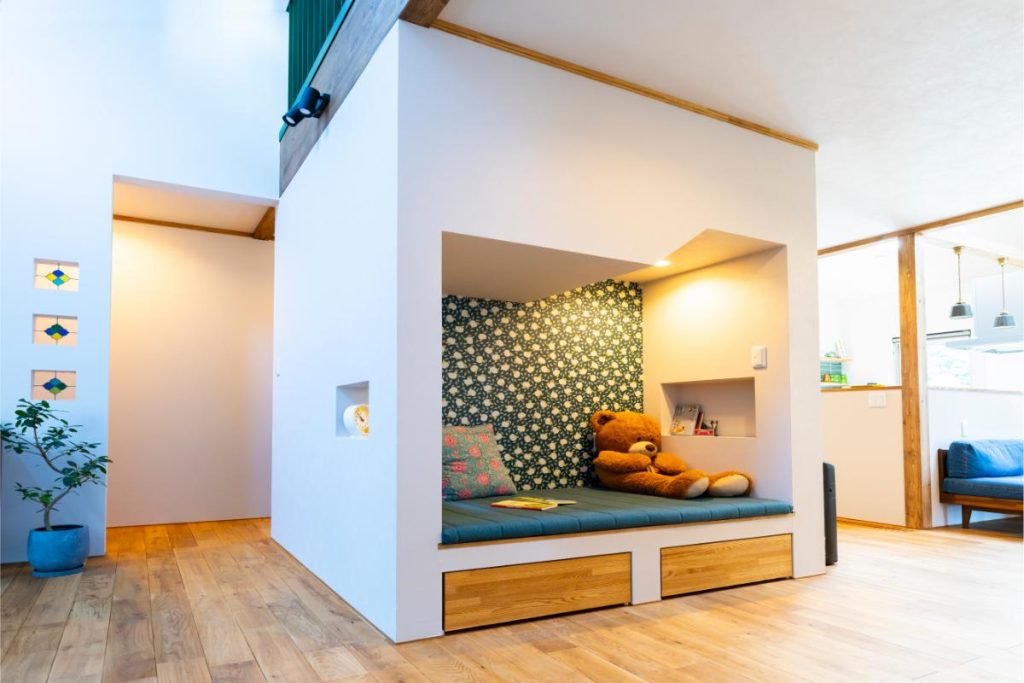 階段下を活用した秘密基地のようなヌックは、子どもたちのお気に入りスペース。正面の壁にはテレビがついています。お友だちが遊びに来ると、みんながここに集まるのだとか。将来は、本棚などに変えることもできる空間です。