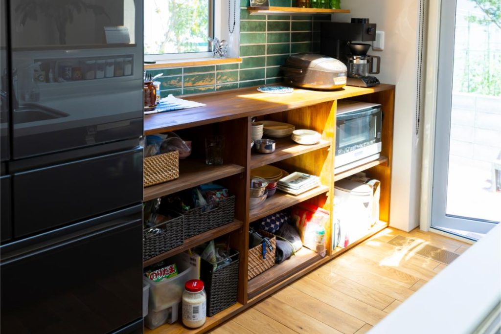 キッチンの棚は、お父さまがぴったりのサイズでDIYしてくれたものです。