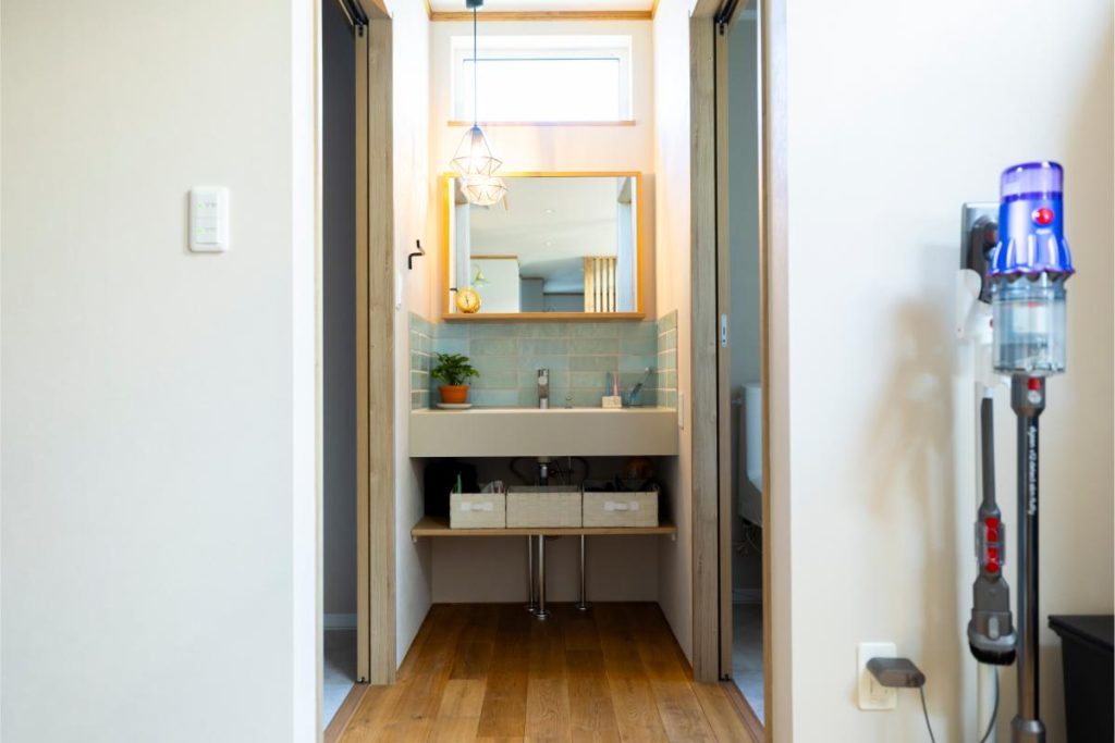 奥さま 洗面台を開放的なスペースにしたかったので、あえて扉は付けませんでした。鏡の下に貼った薄いグリーンのタイルは名古屋モザイク製です。ミラーの枠やナラの床材といった少しずつ異なる木の色をつなぐ色を吟味した結果、洗面台の色はベージュを選びました。