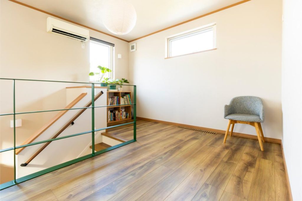 吹き抜けに面した2階のフリースペースは、奥さまが趣味のヨガにも使っている広々とした空間です。