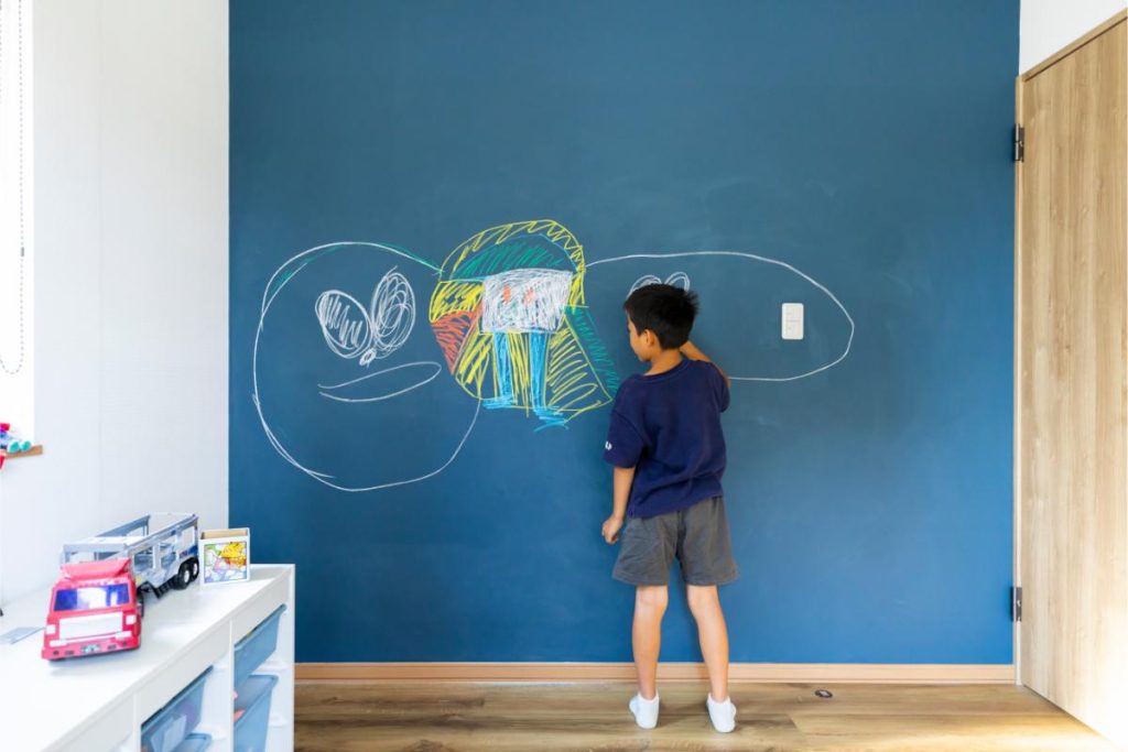 一面だけ黒板シートにしており、壁全面を使って絵が描けるので、小さな画伯が大胆にお絵かきを楽しんでいました。