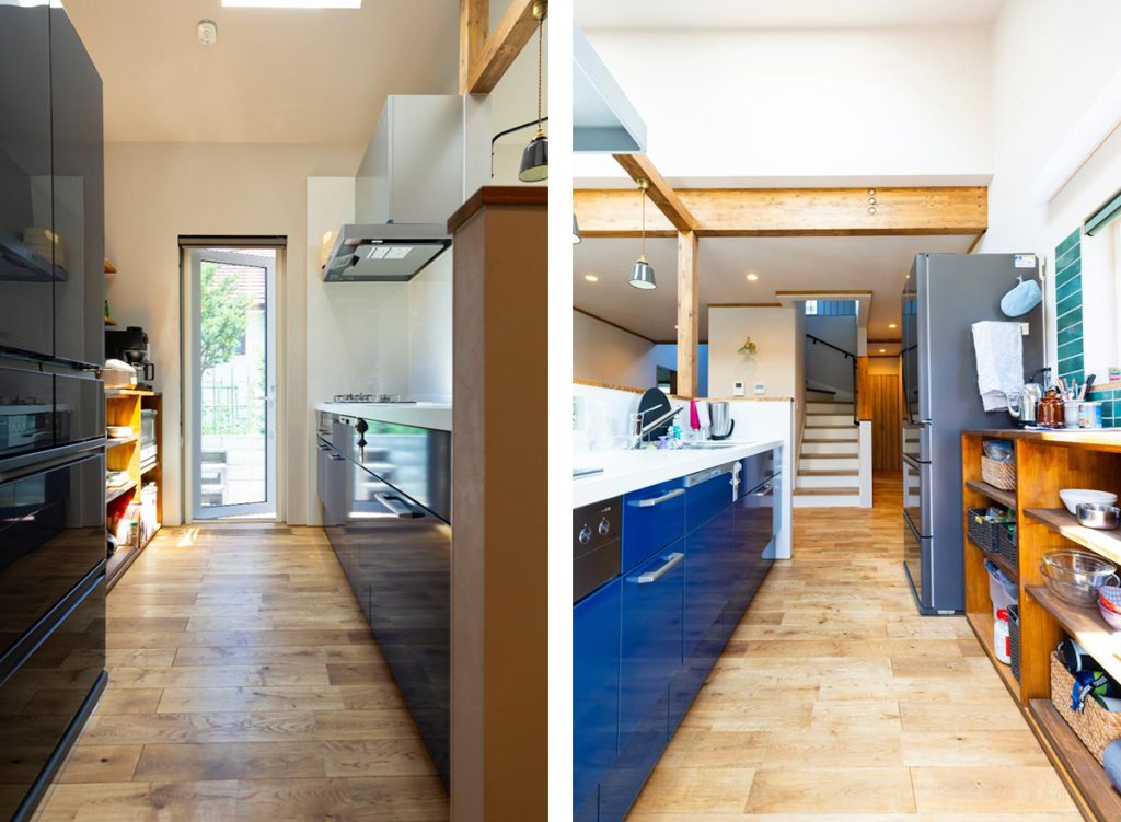 「LIXIL」のシステムキッチンは、アクセントカラーのブルーをチョイス。
