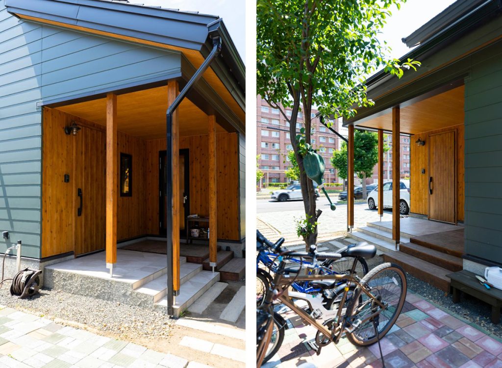 写真左/玄関ポーチには、ダイニングからウッドデッキに出られるテラス窓を付けました。