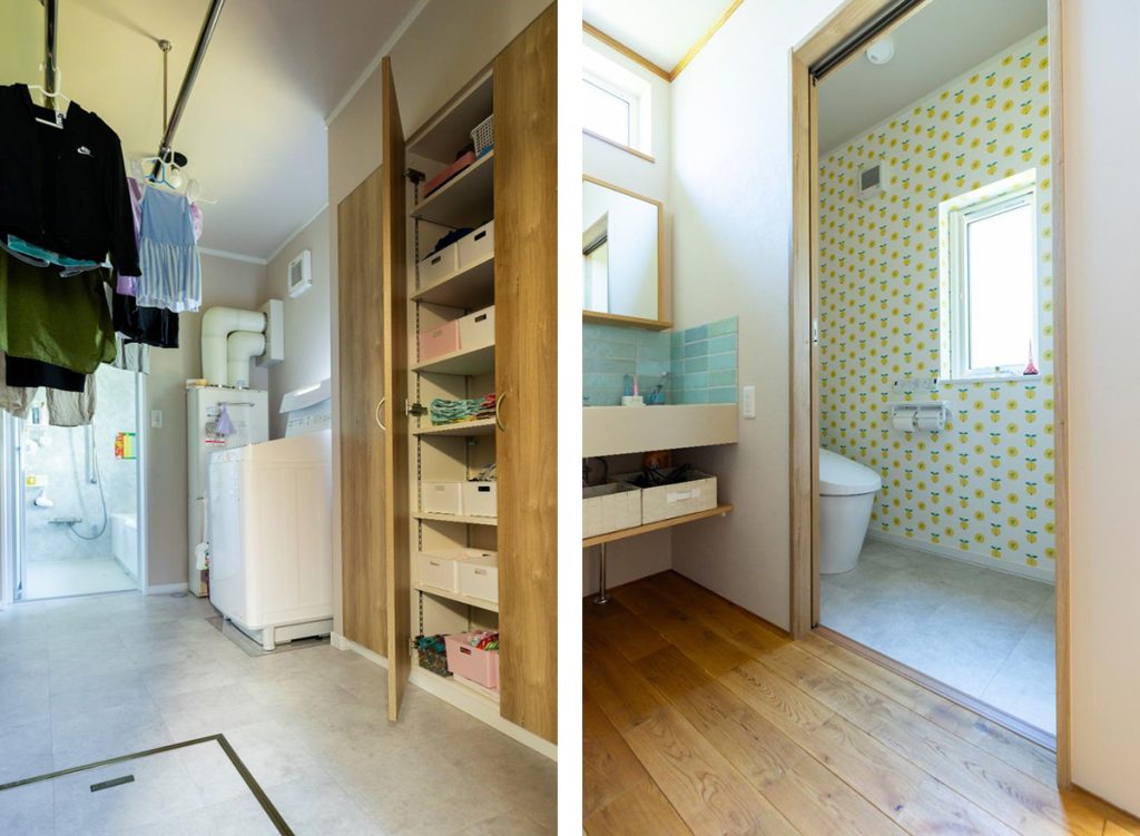 洗面台の左手にある広いユーティリティー(写真左)は、家族の下着やハンカチ、パジャマもしまえる大容量の収納付き。奥のバスルームには、掃除がしやすいように鏡や棚は付けていません。洗面台の右側にはトイレ(写真右)があります。